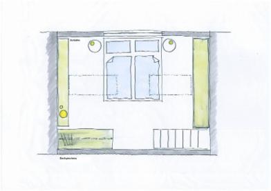 SCHLAFRAUM: Doppelbett (1,80 m x 2,00 m), allergikergerechtes Bettdeckenmenue (Sommer- und Winterdecken) für 2 Personen, Bettwäsche (frisch bezogen), Artemide-Leselampen am Bett, ausreichend Stauraum in zahlreichen hochwertigen Einbauschränken, 3 Fenster Richtung Dünen, Dorfteich und Dorf.